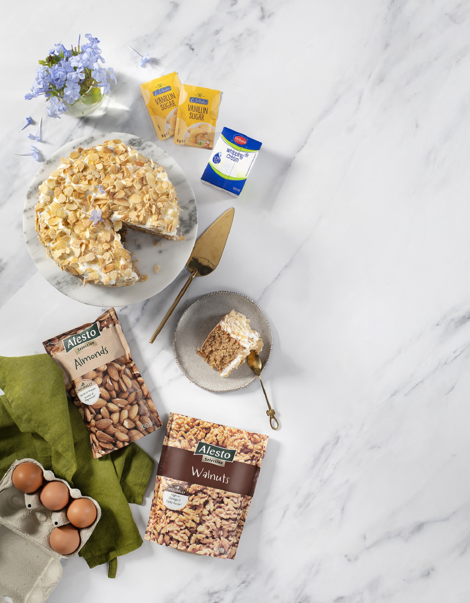 φρυγανιά αλεσμένη και 10 γρ. baking powder διαλυμένο σε 30 γρ. μπράντι. Προσθέτουμε τα αμύγδαλα και κλείνουμε το μίξερ αμέσως μόλις ανακατευτούν. Αδειάζουμε το μείγμα σε φόρμα διαμέτρου 22 εκ., την οποία έχουμε καλύψει με λαδόκολλα. Ψήνουμε σε μέτριο φούρνο για 45' περίπου. Όταν κρυώσει, ξεφορμάρουμε, τοποθετούμε σε πιατέλα και περιλούζουμε την αμυγδαλότουρτα με 35 γρ. μπράντι ανακατεμένο με 35 γρ. γάλα. Χτυπάμε 300 γρ. κρέμα γάλακτος 30% λιπαρά Milbona μαζί με 1 κουταλιά σούπας ζάχαρη άχνη σε μίξερ και ψηλή ταχύτητα, παρακολουθώντας συνεχώς. Μόλις δούμε ότι φαίνονται οι γραμμές που αφήνει το σύρμα στην κρέμα, κλείνουμε το μίξερ και καλύπτουμε την τούρτα μας. Γαρνίρουμε, αν θέλουμε, με καβουρδισμένα αμύγδαλα φιλέ.