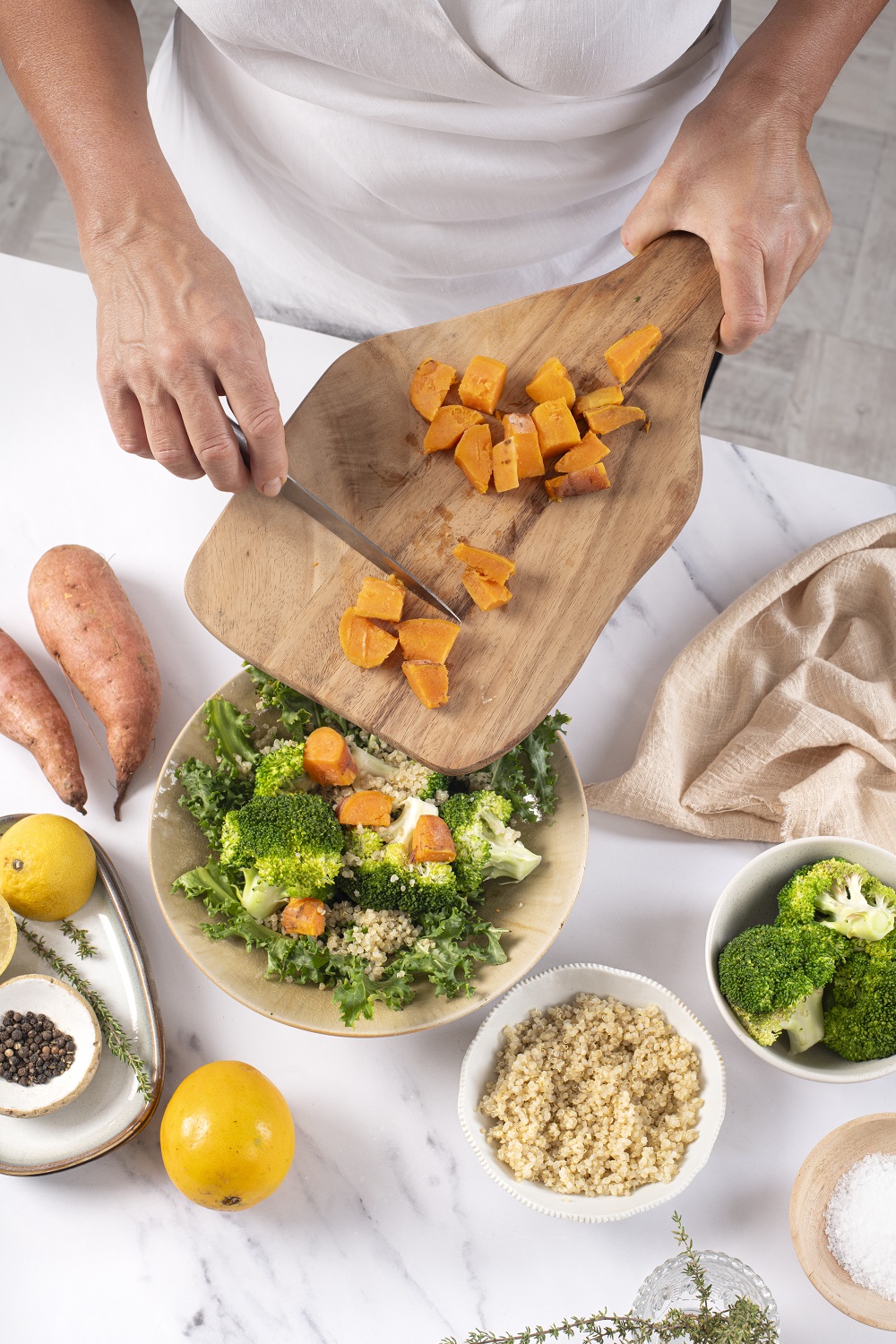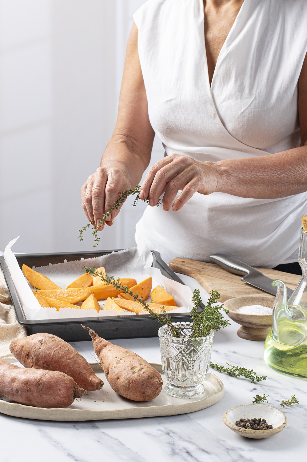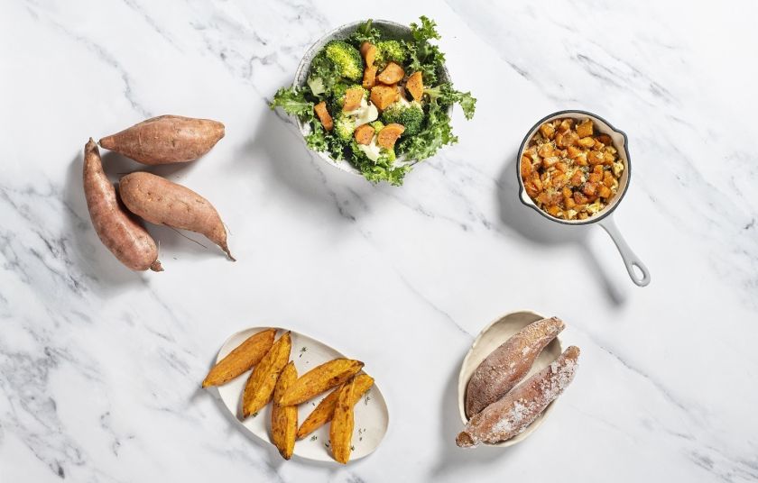 Για ένα ελαφρύ χορτοφαγικό γεύμα, ετοιμάστε γλυκοπατάτες ψητές στον φούρνο με διάφορα λαχανικά ή σαν συνοδευτικό σε σαλάτα με μπρόκολο, κινόα και σάλτσα εσπεριδοειδών.