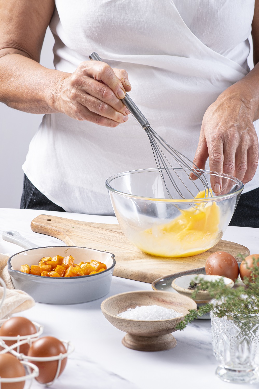 Γλυκοπατάτες με αβγά σαν σκραμπλ ή σε μορφή ομελέτας. Μια εναλλακτική εκδοχή του γνωστού παραδοσιακού πιάτου που ετοιμάζεται πάρα πολύ γρήγορα. Συμπληρώστε με ανθό θαλασσινού αλατιού και αν θέλετε με φρέσκα αρωματικά.