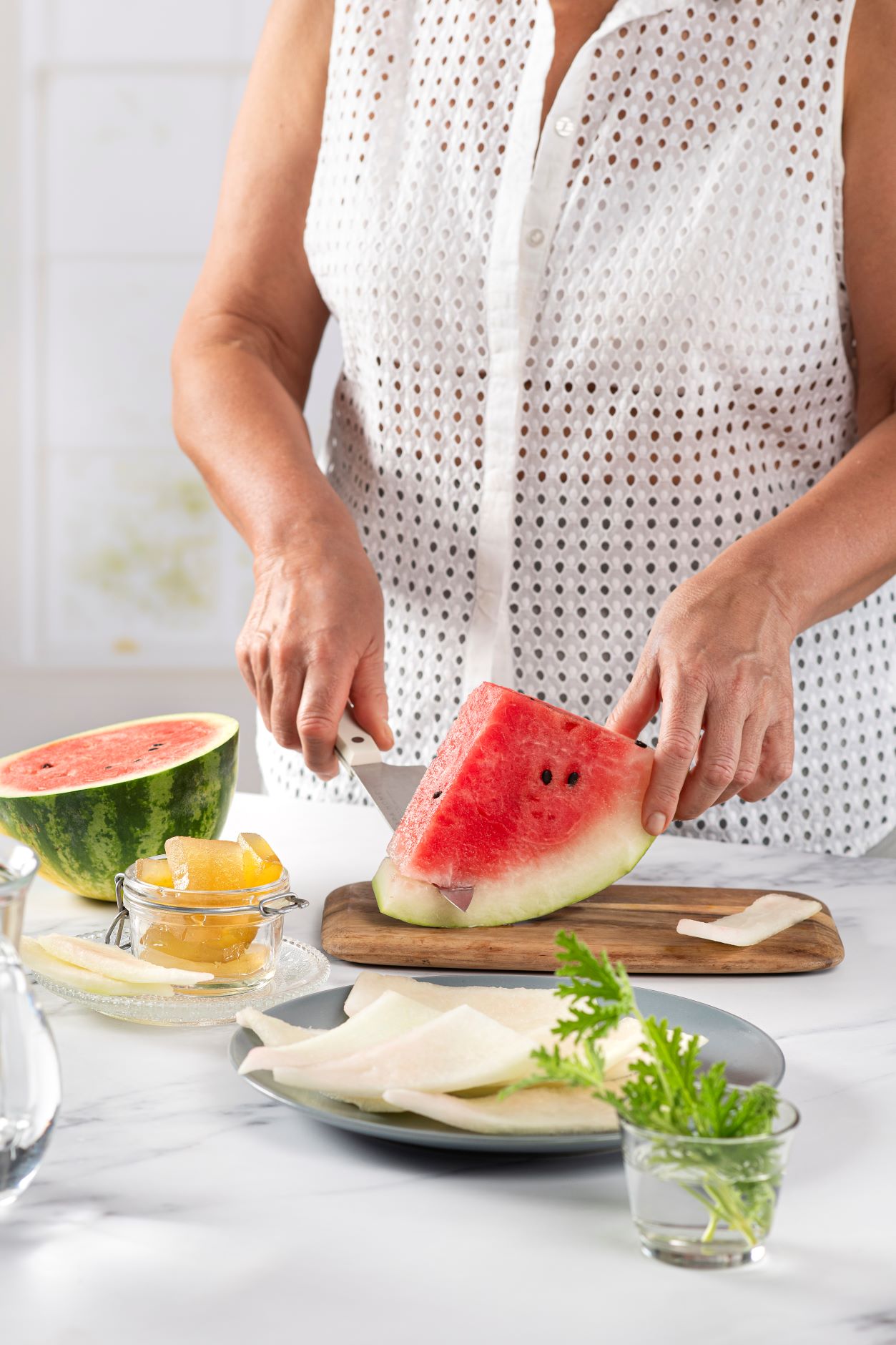 Αξιοποιούμε το άσπρο μέρος από το καρπούζι για να φτιάξουμε το γνωστό σε όλους και άκρως καλοκαιρινό και τραγανό γλυκό του κουταλιού. Ιδανικό για γλυκό είναι βεβαίως το καρπούζι με χοντρή φλούδα, η διαδικασία είναι σχετικά απλή και το αποτέλεσμα σίγουρα σε ανταμείβει.