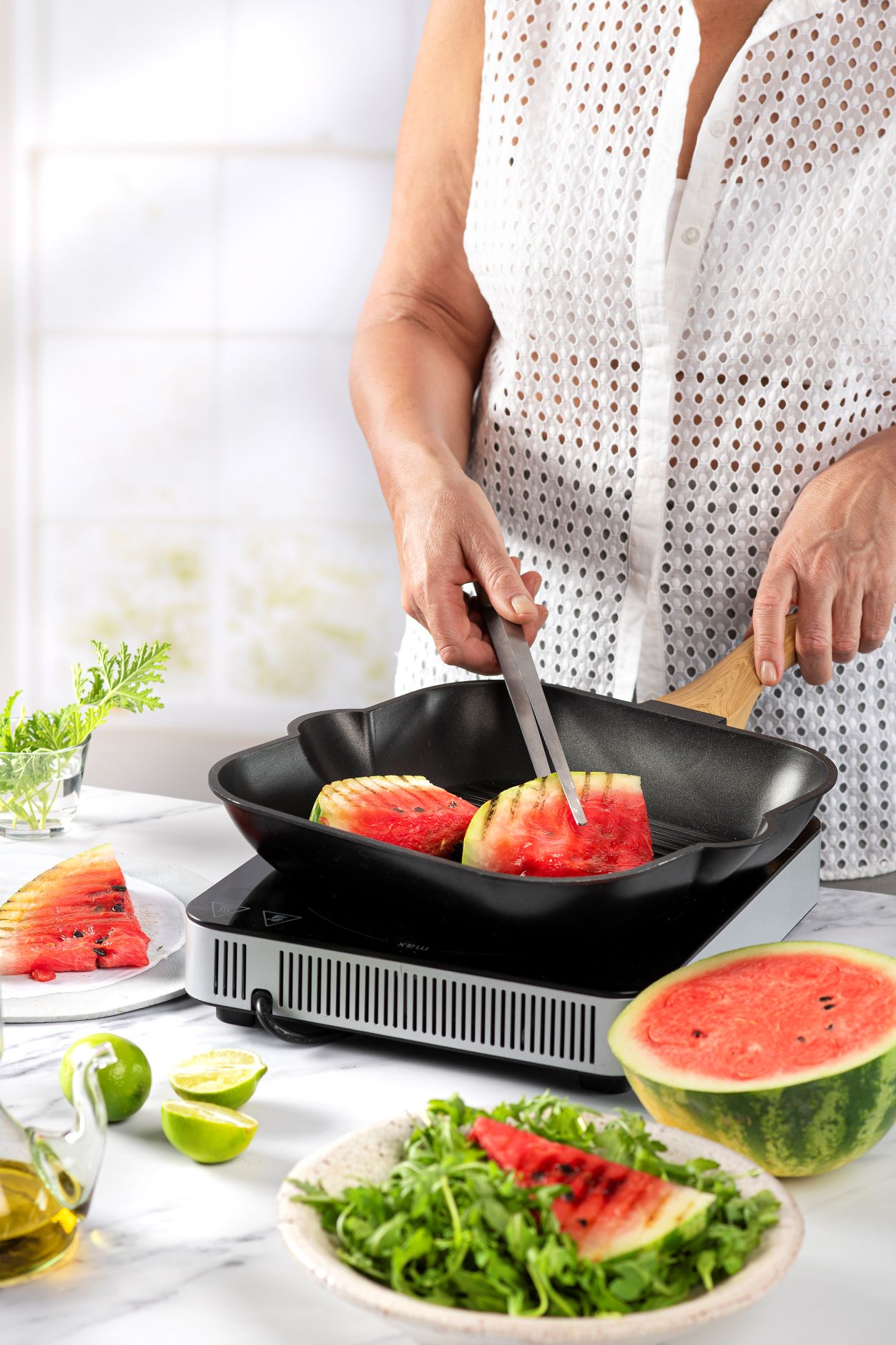 Λεπτές φέτες καρπούζι σε σχαροτήγανο