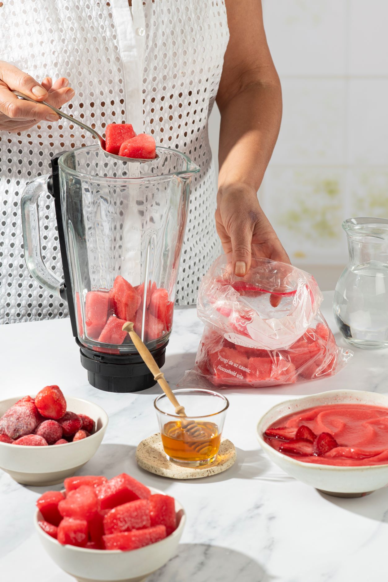 Κόβουμε το καρπούζι σε κομμάτια, αφαιρούμε τα κουκούτσια και το παγώνουμε. Το χτυπάμε σε μπλέντερ μαζί με φρέσκιες ή παγωμένες φράουλες και μέλι ή σιρόπι κι έχουμε ένα ασυνήθιστο παγωτό στη στιγμή.