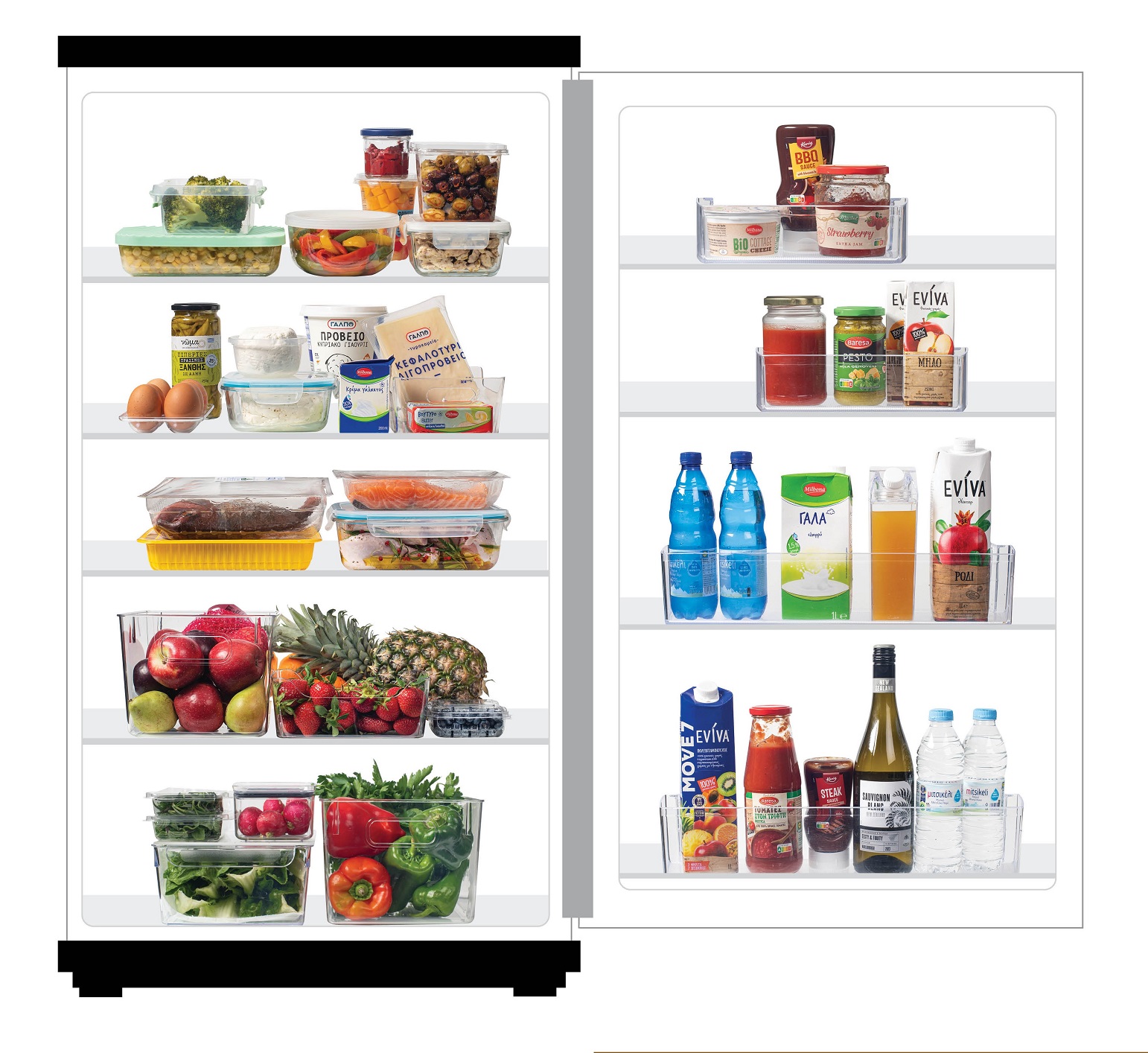 Στο πάνω ράφι τα έτοιμα φαγητά, στο μεσαίο τα γαλακτοκομικά, στο κάτω τα ωμά τρόφιμα, στα συρτάρια τα λαχανικά και τα φρούτα και στην πόρτα συσκευασίες tetra pak, μπουκάλια και βαζάκια. - ΔΙΑΦΑΝΗ ΔΟΧΕΙΑ