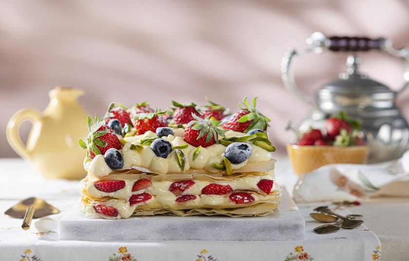 - Συναρμολογούμε το mille-feuille πριν το σερβίρισμα. Κοσκινίζουμε την άχνη πάνω στις τρεις στρώσεις φύλλου. Τοποθετούμε τη βάση στην πιατέλα και απλώνουμε πάνω το 1/3 της κρέμας. Σκορπάμε ψιλοκομμένες φράουλες και blueberries και βάζουμε από πάνω την μεσαία στρώση. Απλώνουμε το δεύτερο τρίτο της κρέμας και φρούτα και τελειώνουμε τοποθετώντας πολύ προσεκτικά την τελευταία στρώση και την υπόλοιπη κρέμα και φρούτα. Σερβίρουμε αμέσως.