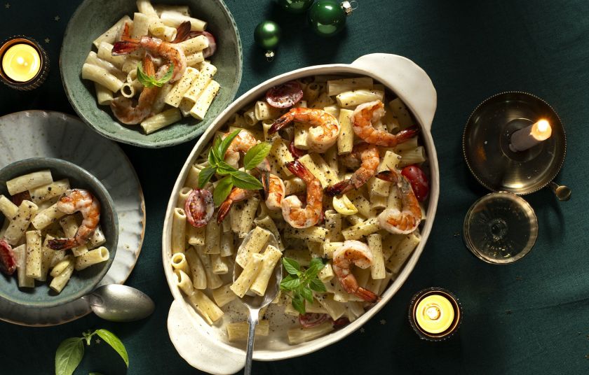 - Βράζουμε στη συνέχεια τα μακαρόνια, τα σουρώνουμε και τα βάζουμε σε λεκάνη. Προσθέτουμε την κρέμα, τα ντοματίνια (μοιρασμένα στη μέση) και λίγο φρέσκο βασιλικό κι ανακατεύουμε. Αδειάζουμε σε ταψί φούρνου, βάζουμε τις γαρίδες ανάμεσα στα rigatoni και ψήνουμε σε δυνατό φούρνο στο γκριλ μέχρι να κοκκινίσει ελαφρά.
