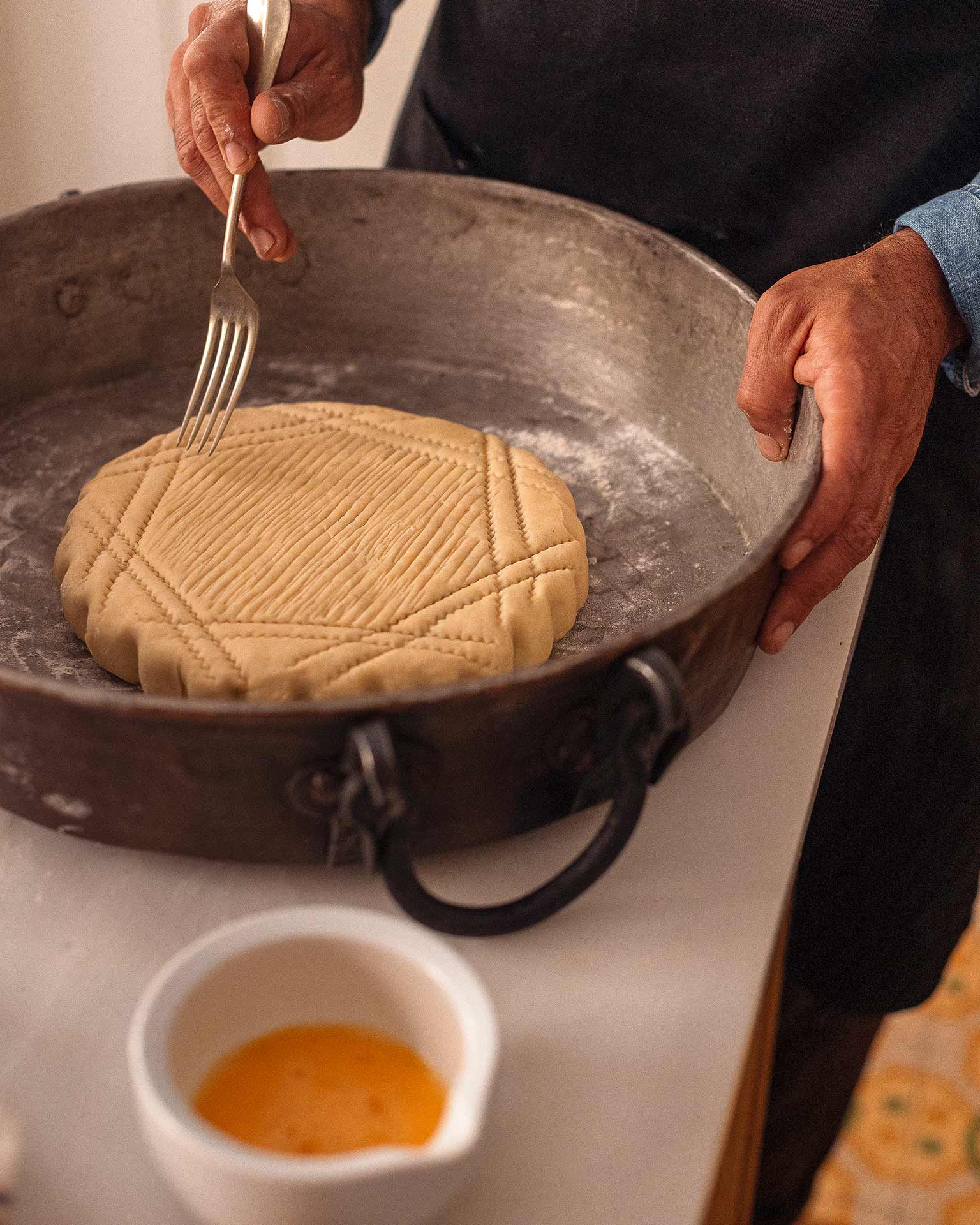 - Σε αλευρωμένη επιφάνεια ανοίγουμε με τον πλάστη τη ζύμη σε φύλλο χοντρό, πάχους περίπου 2 εκ.