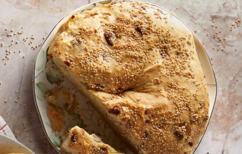 - Ραντίζουμε το καρβέλι με λίγο νερό, το πασπαλίζουμε με το σουσάμι και ψήνουμε για περίπου 50 λεπτά στο μεσαίο ράφι του φούρνου.
